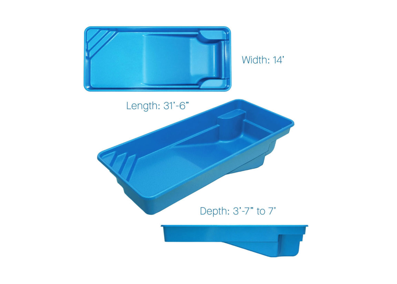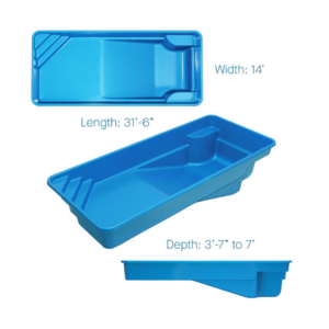 - Dimensions: 14′ x 31’6″, 3’7″ to 7′ deep, holding 8,900 gallons.